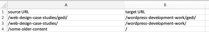 Next, we saved the spreadsheet as a “CSV” format and then used a WordPress plugin called Redirection to import that CSV file into WordPress. You will want to install Redirection on your new site website, and then import the CSV file to the new website.